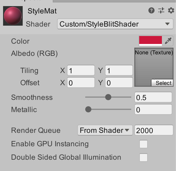 For the project itself, I’ve created a fairly empty project with a single capsule shape that’s using a custom material and shader. There isn’t anything special about the shader – it’s a base on which I’ll implement the StyleBlit algorithm in the coming weeks. Here’s what is looks like: